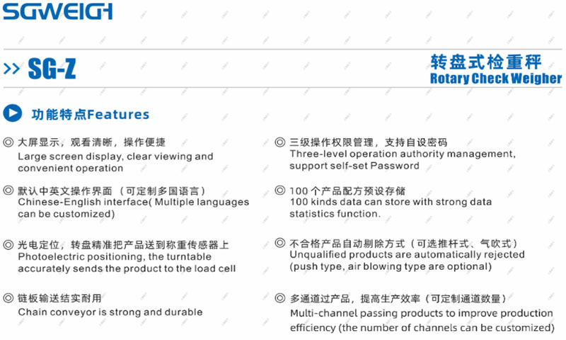 • 采用連續(xù)動態(tài)自動稱重方式檢驗物品重量,配以自動分選機構(gòu),從而實現(xiàn)在流水線上的高精度的重量檢驗及分選。按照符合客戶要求的重量進行分區(qū),這樣可以將分選過程的人工成本降到較低,并且優(yōu)化生產(chǎn)過程。